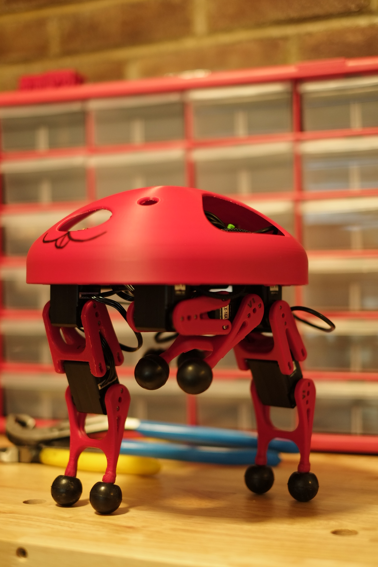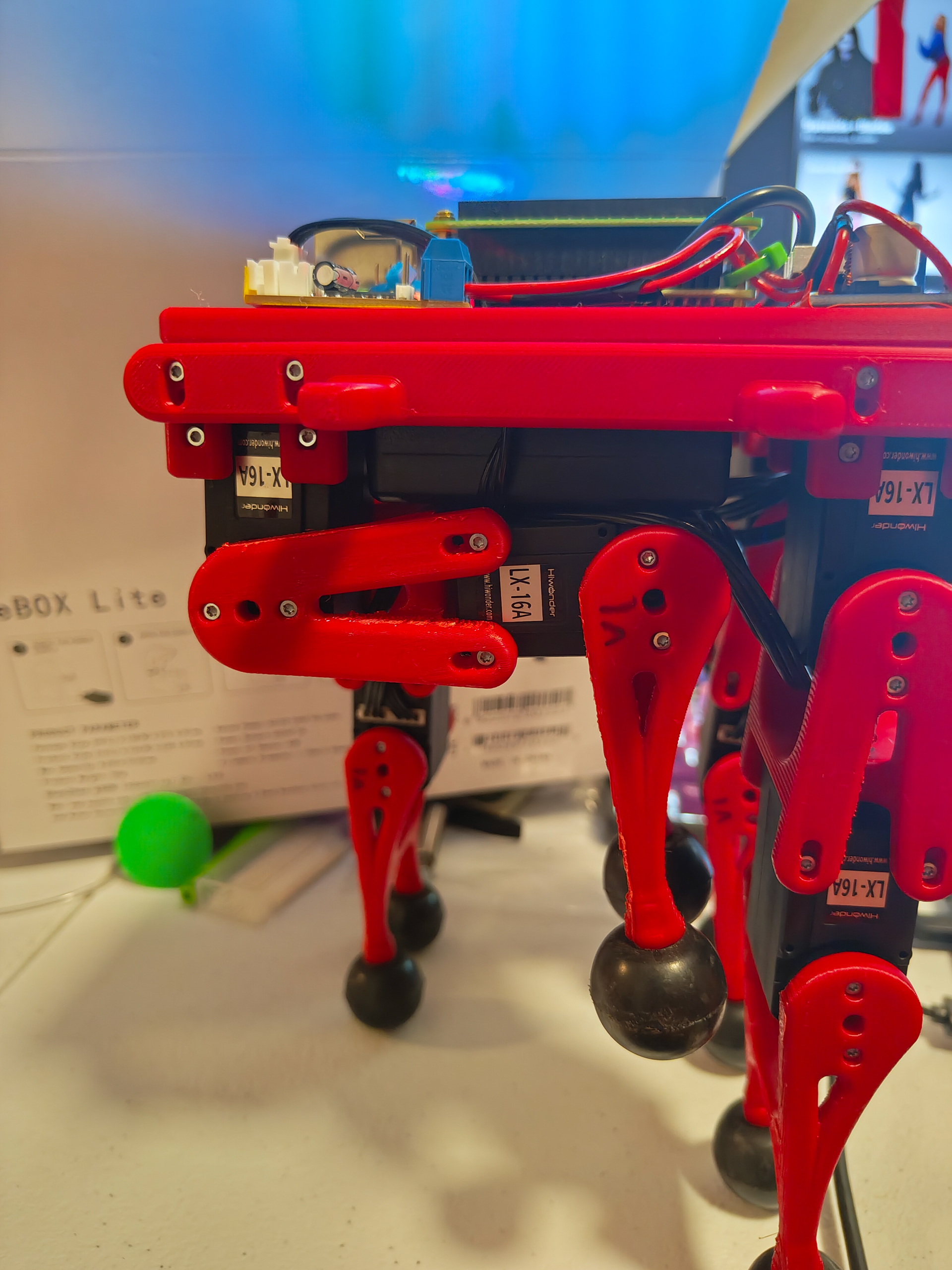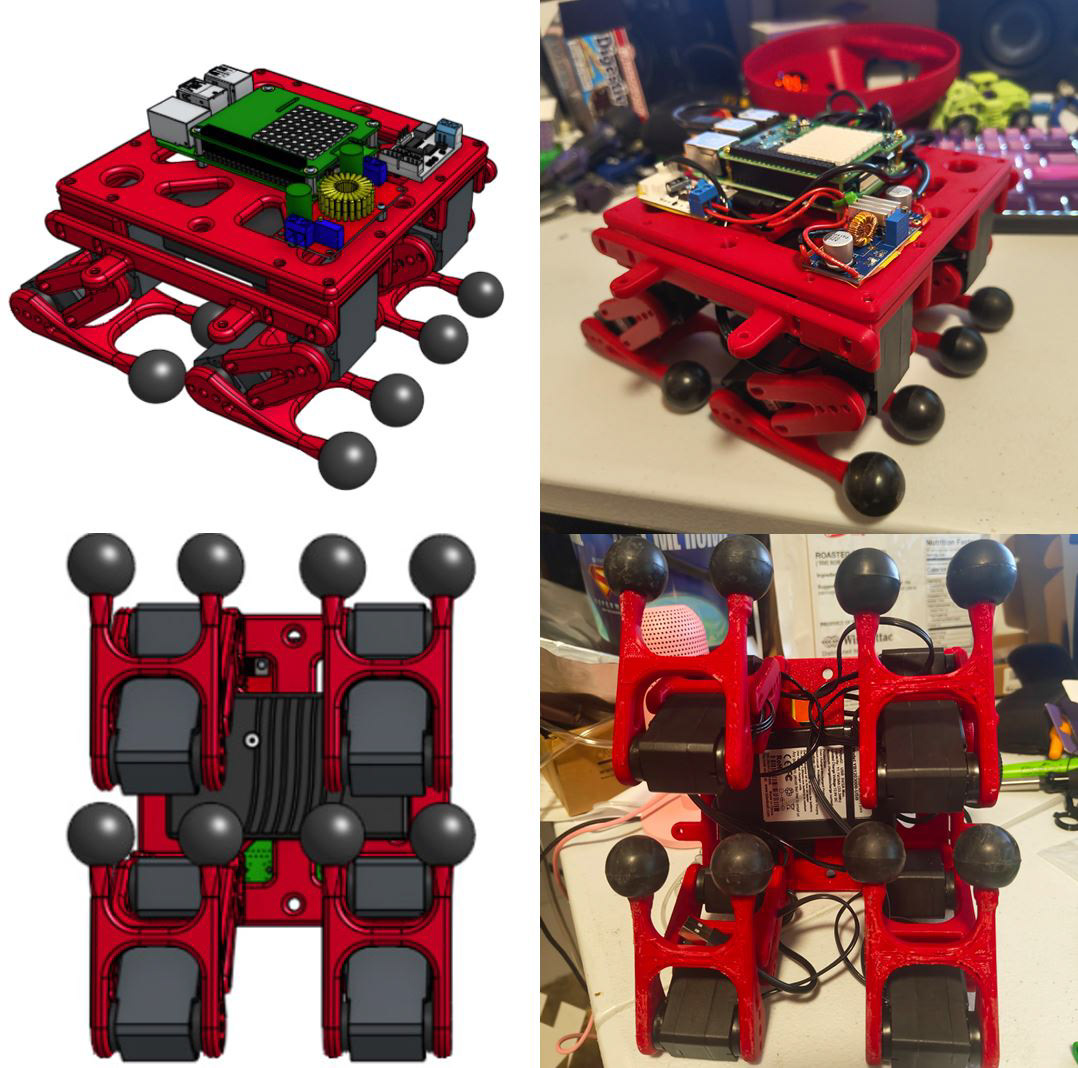 Clifford is a remote controlled quadruped robot with two degrees of freedom per leg, optimized for moving in a straight line using a Raspberry Pi and serial bus servos.