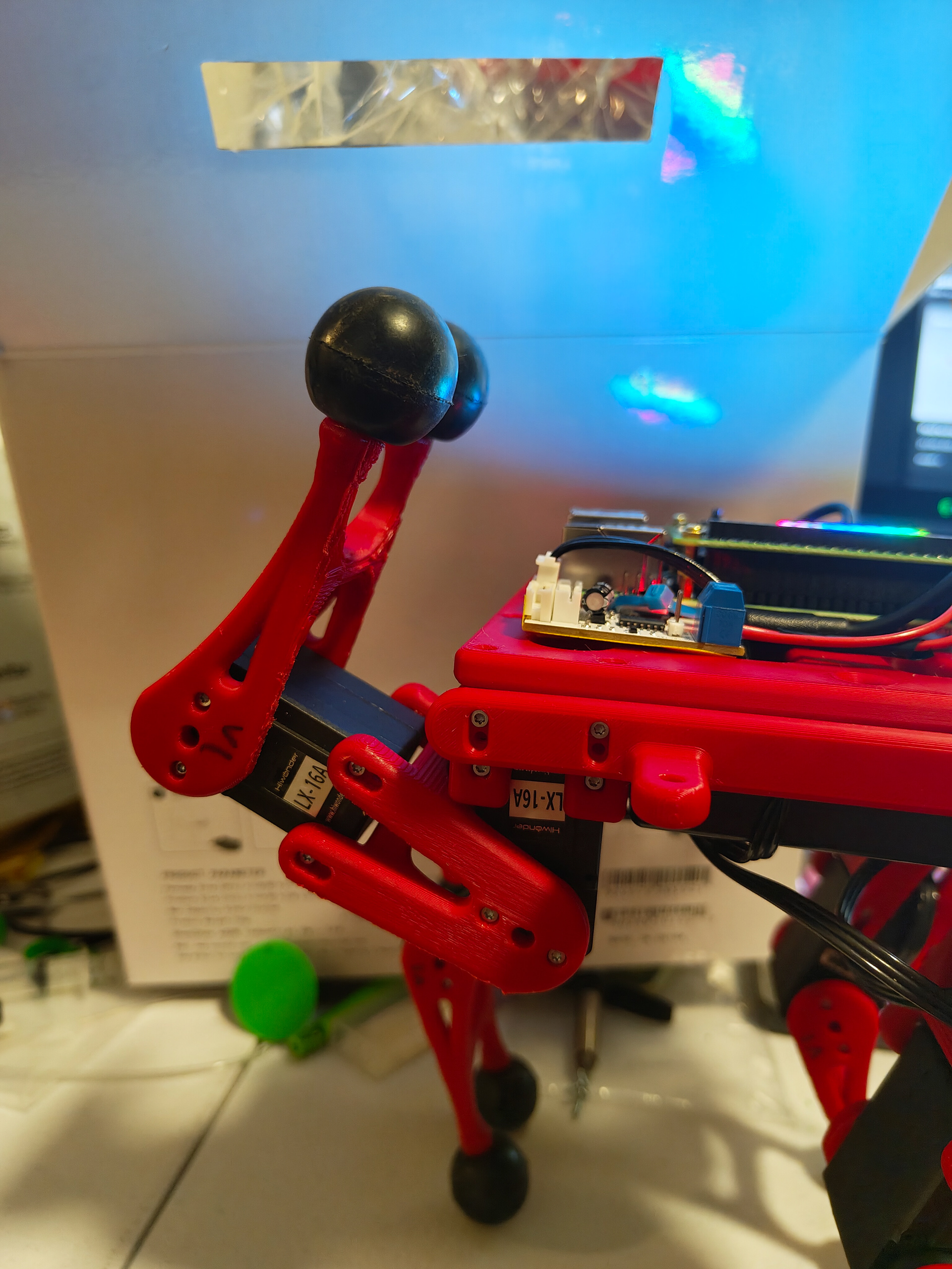 Because Clifford only has pitch movements, I gave each leg two feet to maximize stability. When the robot moves, there will be a maximum of 2 legs on the ground at a time, so 2 feet per leg allows the robot to "cheat" by having 4 points of contact with the ground at all time. Rubber balls for traction screw directly onto the legs.