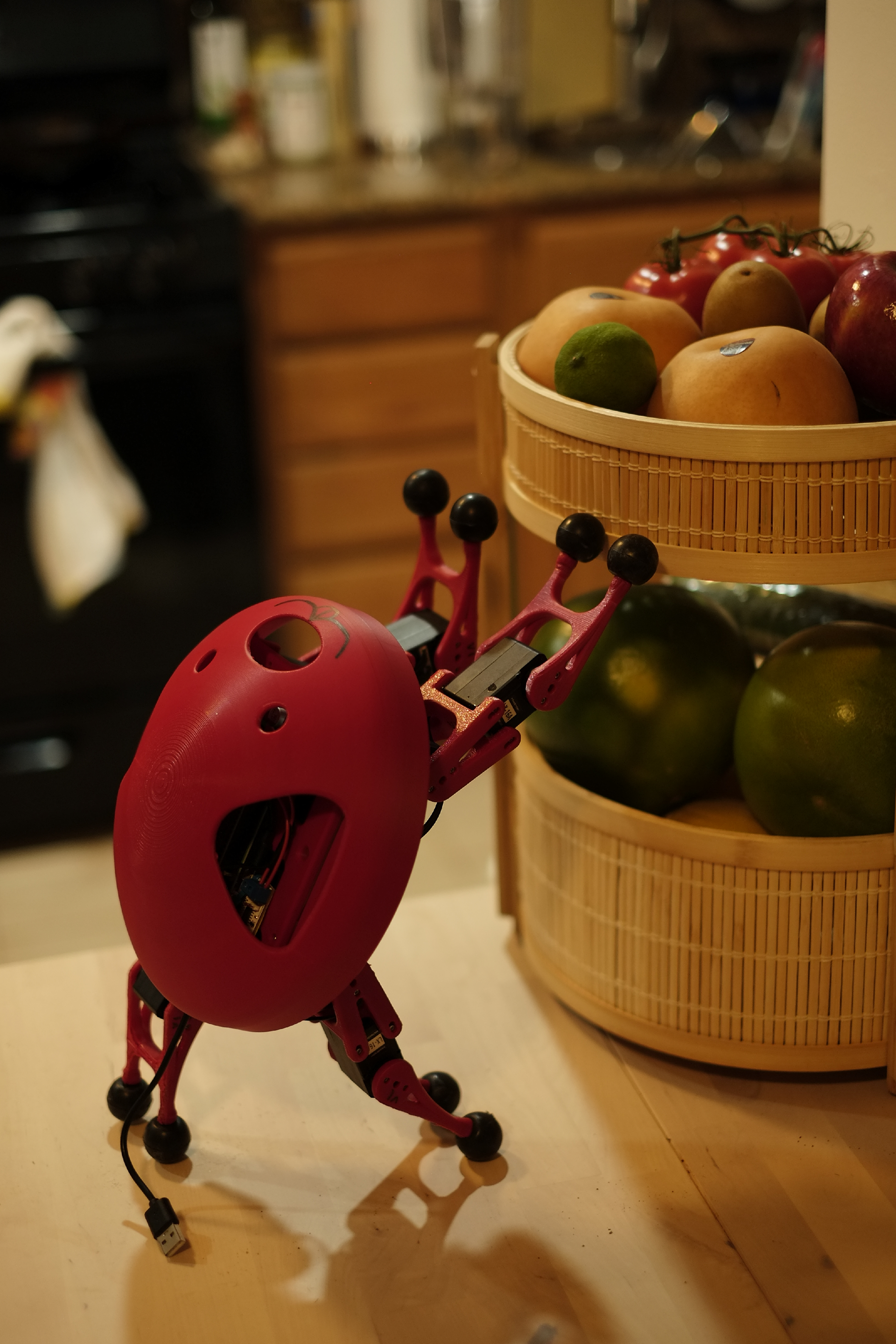 I designed Clifford to be as simple as possible, while staying within the requirements of the course. The legs are identical and the wires and electronics are easily accessible so the robot can be charged without disassembly. I had to travel during the middle of the semester, so Clifford is able to fit in a standard backpack and the battery can be easily removed for airport security.