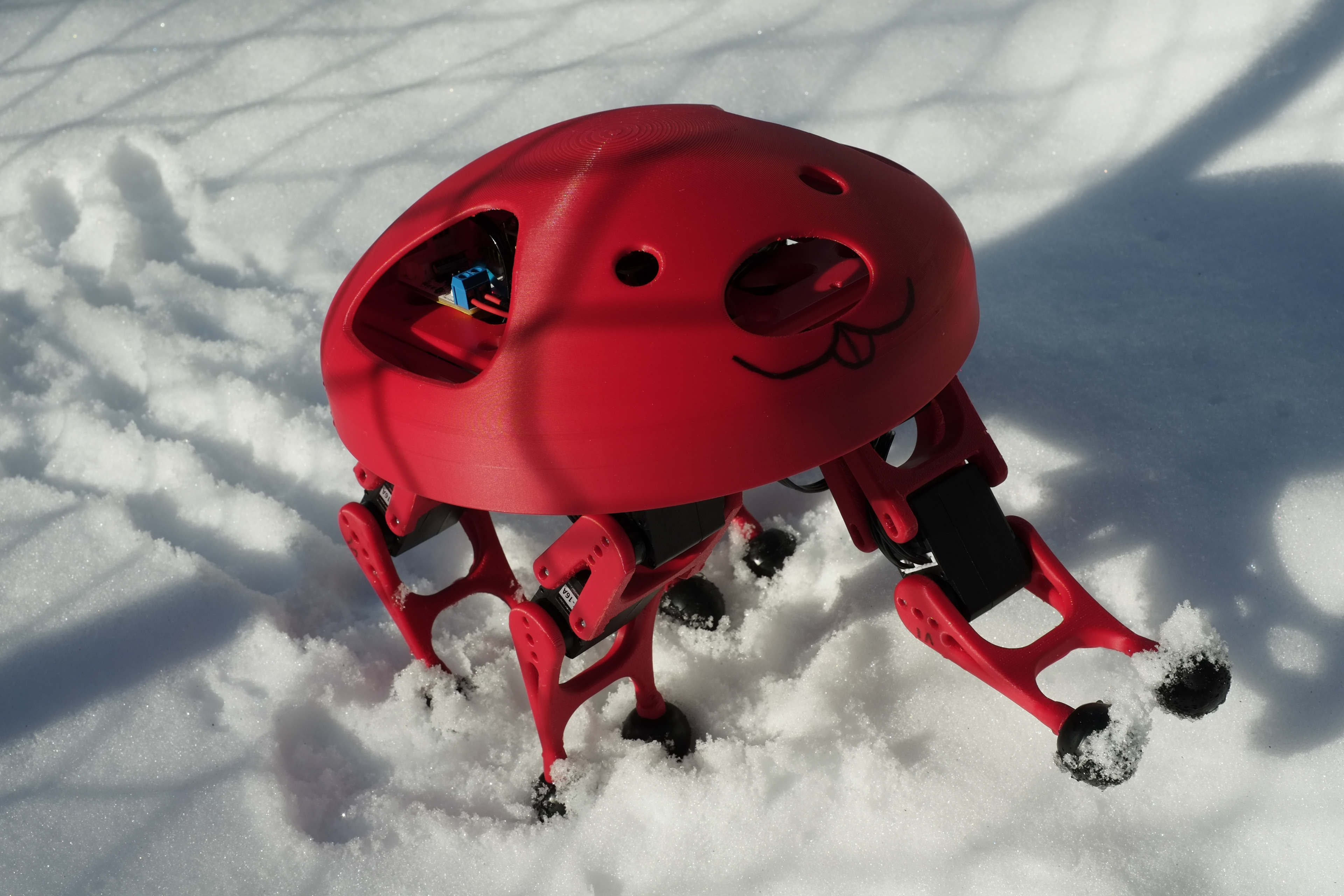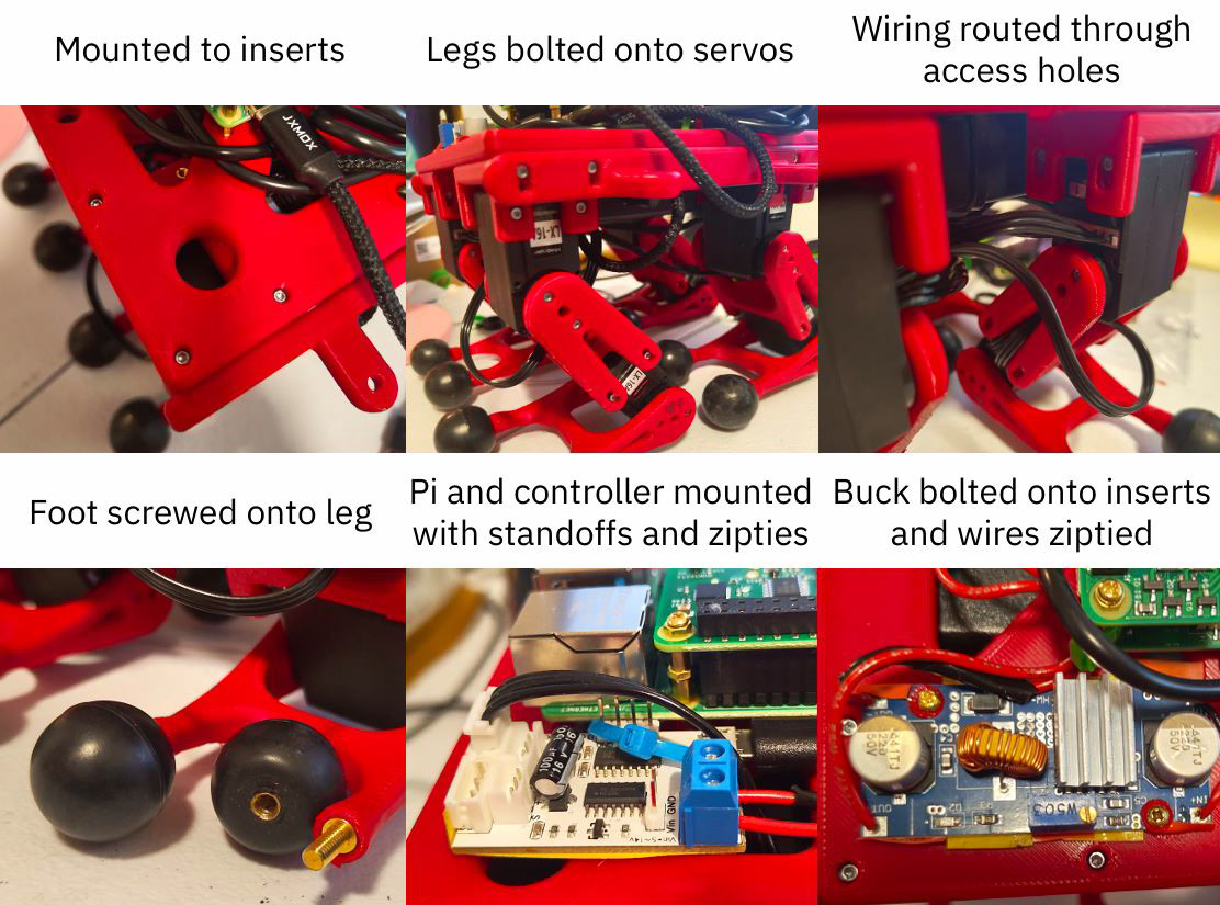 The entire structure of the robot was first made in Onshape before printing out the structure. Essentially, the robot is a sandwich of electronics with legs. The main chassis is a square board that has fragile electronics on top and the heavier battery pack on the bottom keeps the center of gravity low for stability. The legs are built separately and fixed to the bottom of the chassis. All hardware is M2 and loose parts such as wires and the battery pack are strapped down using zip ties. To keep the robot safe during transport or during falls/rolls, there is a helmet that fixes to the chassis with ventilation holes.